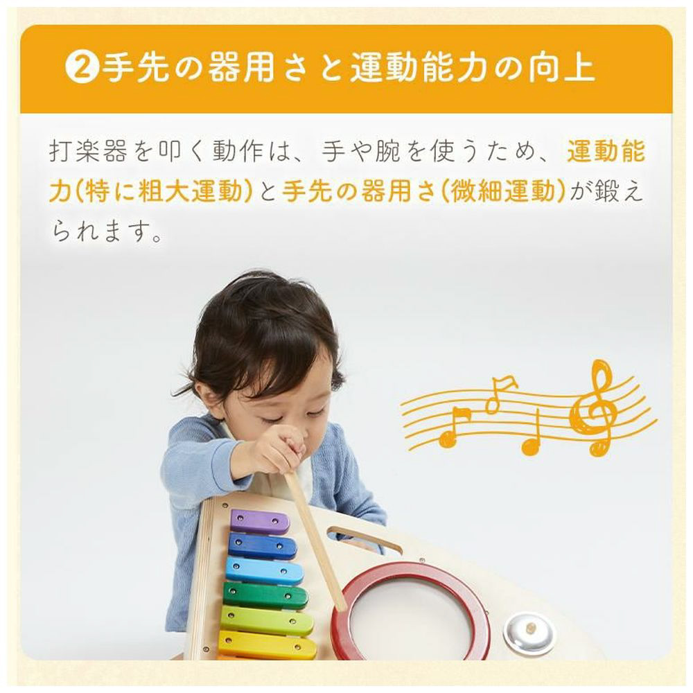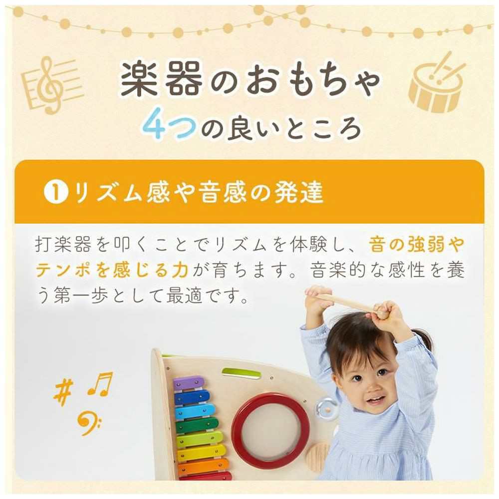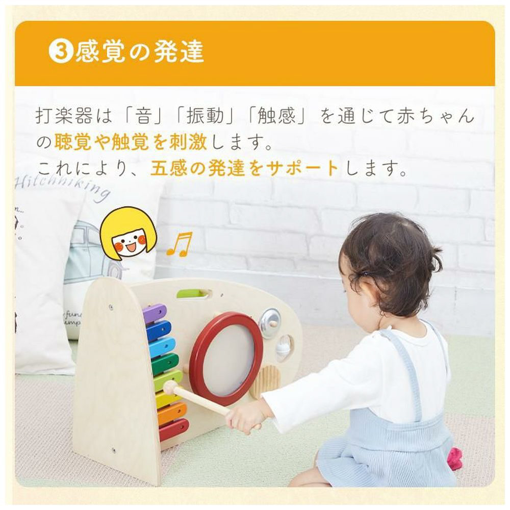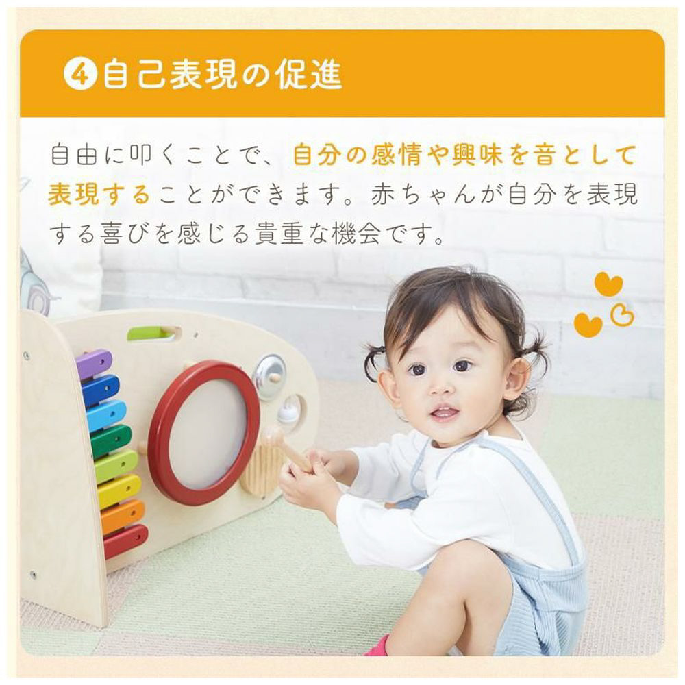 両面で遊べる木のおもちゃ。木琴・太鼓・シンバル・鈴・ギロの5種類の音遊びと転がし遊びが両面で楽しめる大型トイ。本体を横に倒して音遊びもできます。持ち運びに便利な持ち手つき。赤ちゃんに優しい肌触り・天然木のぬくもりは木のおもちゃの特性です。※素材の特性上木琴の音は調律されていません