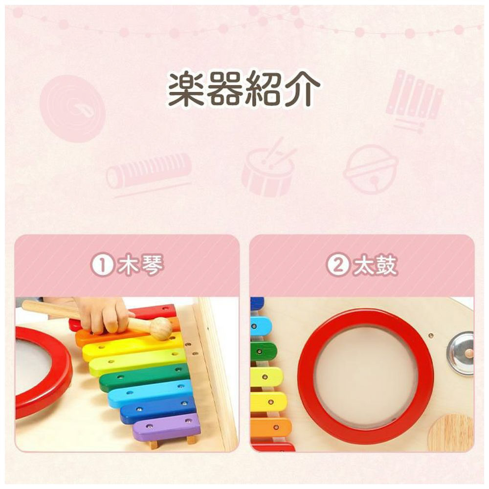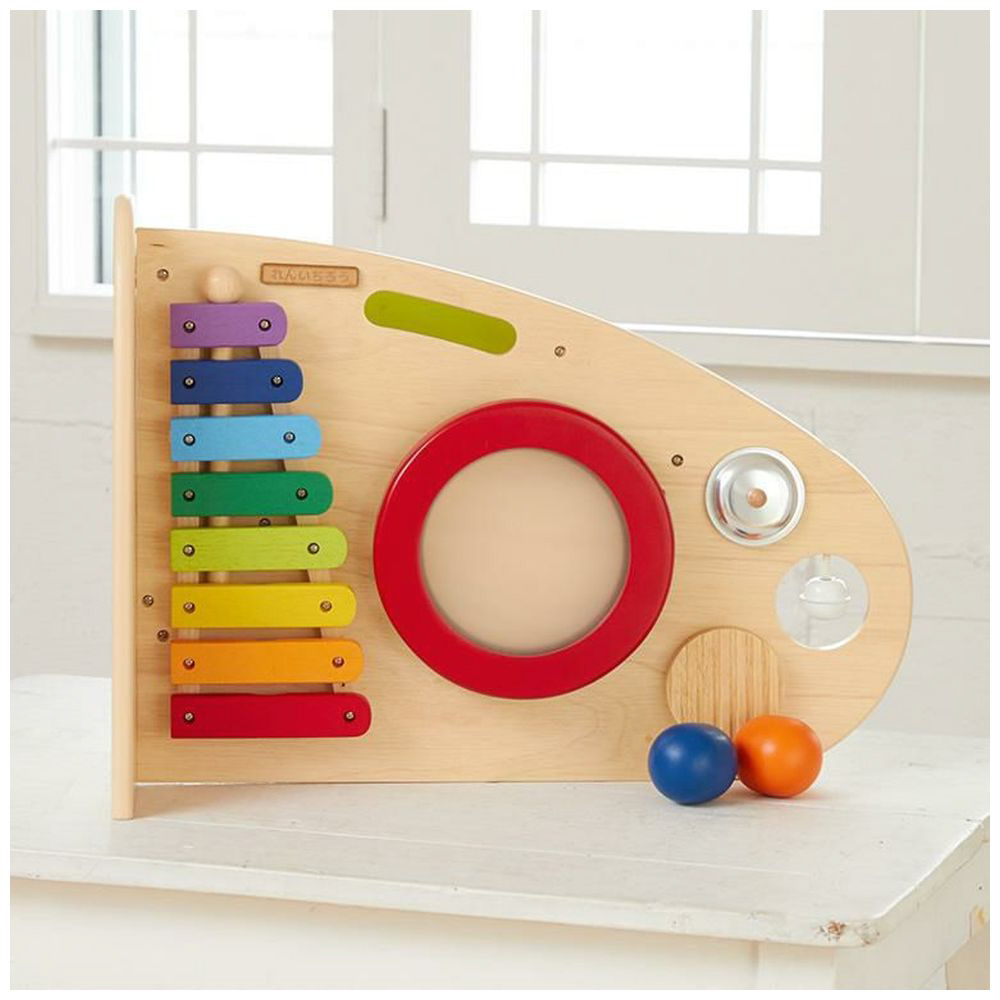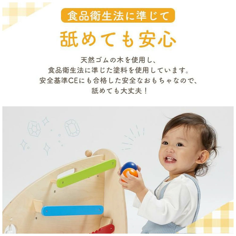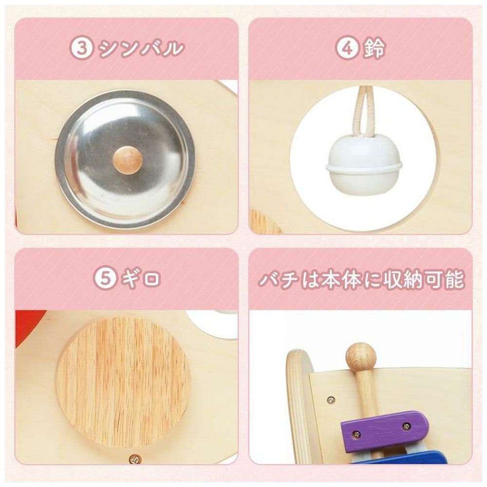 両面で遊べる木のおもちゃ。木琴・太鼓・シンバル・鈴・ギロの5種類の音遊びと転がし遊びが両面で楽しめる大型トイ。本体を横に倒して音遊びもできます。持ち運びに便利な持ち手つき。赤ちゃんに優しい肌触り・天然木のぬくもりは木のおもちゃの特性です。※素材の特性上木琴の音は調律されていません