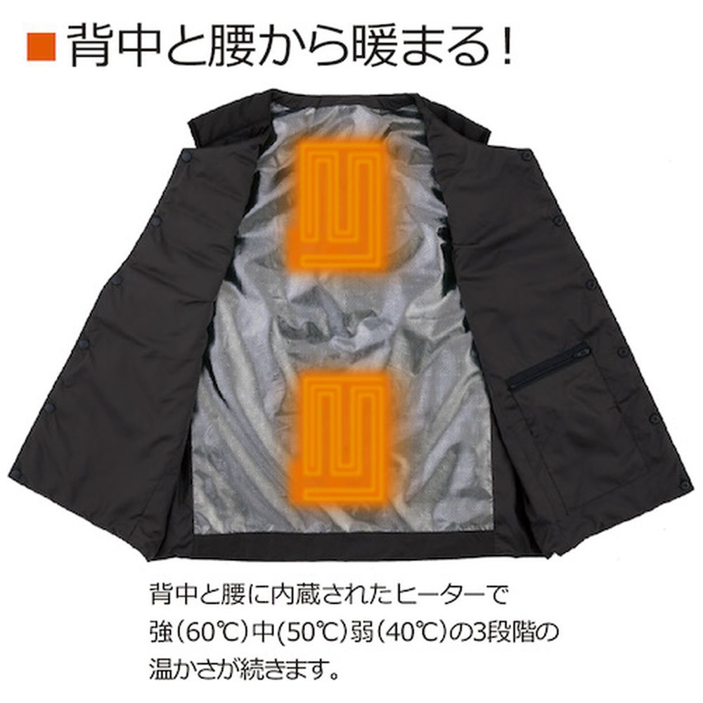 ■背中と腰の2ヵ所で発熱し、アルミ裏地で熱を逃がさない構造をしています。