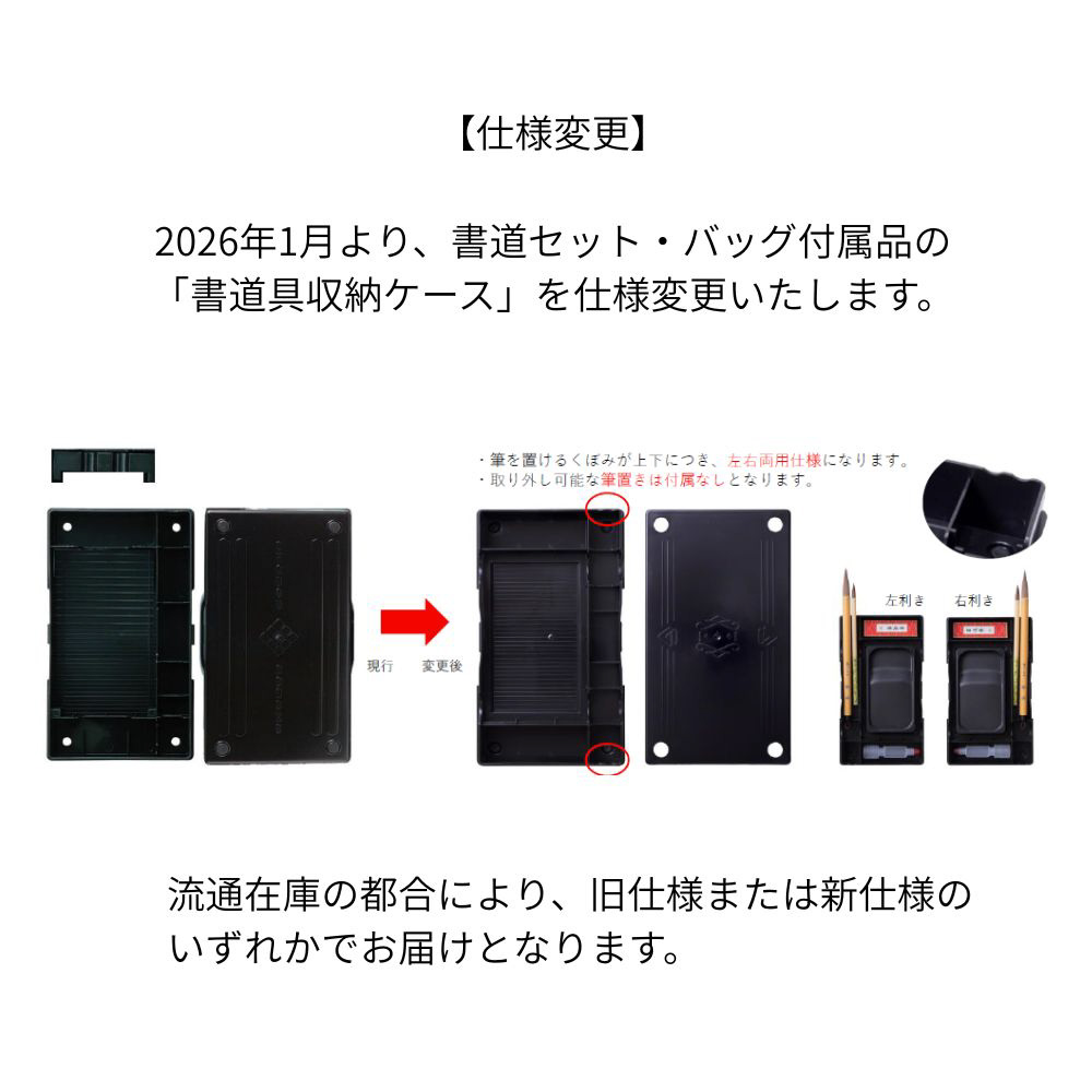 太筆、細筆、固形墨、墨液(180mL)、軽量両面硯(表面:硯、裏面:墨池)、ラバーツイン文鎮(185g)、下敷、半紙ばさみ、筆巻、スポイト式水差し、書道具収納ケース、筆置き、筆の説明書、ショルダーベルト