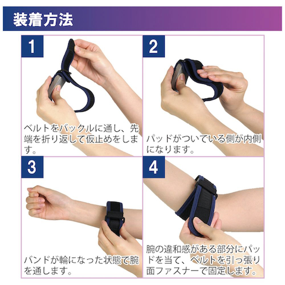 ■肘に違和感を感じたときに、バンド(パッド付)1本で肘への衝撃をブロック、前腕の動きを抑えることで肘への負担を軽減します。
