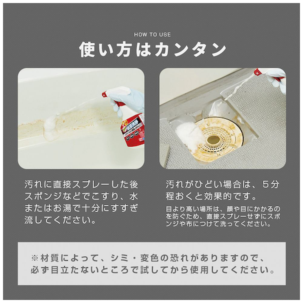 ・<使えるところ>浴槽、浴室の壁、床・ドア、シャワーカーテン、風呂フタ、洗面器、イス等の小物※材質によって、シミ・変色の恐れがありますので、必ず目立たないところで試してから使用してください。