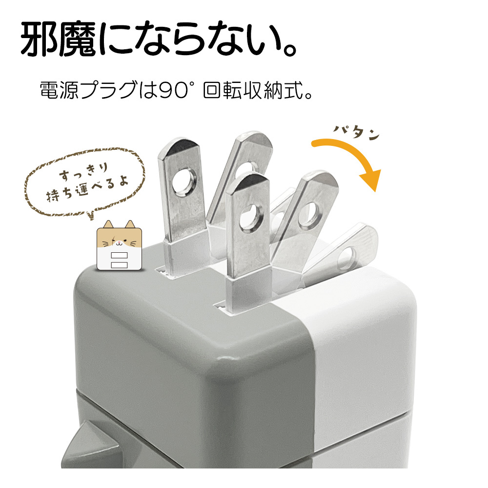 本製品はUSB Type-Aポートを2個搭載したAC充電器です。2ポート合計最大出力は5V/2.4Aです。入力電圧は100-240Vに対応しています。Smart ICを搭載しています。iOS(iPhone、iPad等)とAndroid(スマートフォン、タブレット等)を自動で識別し、最適な電流値で充電する事が可能です。電源プラグは持ち運びに便利な、90°回転収納式を採用しています。