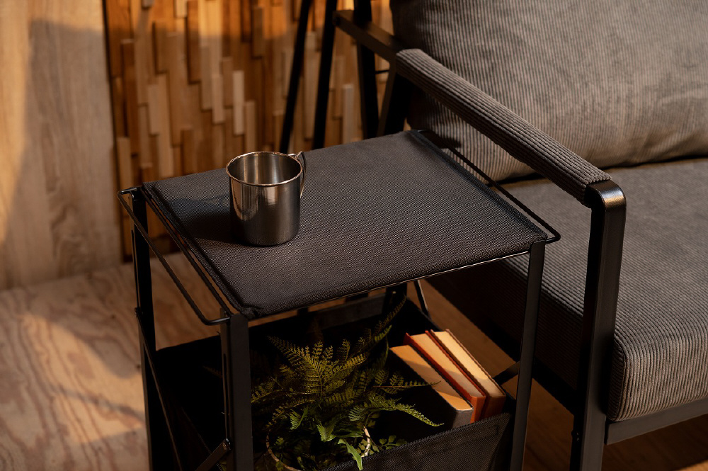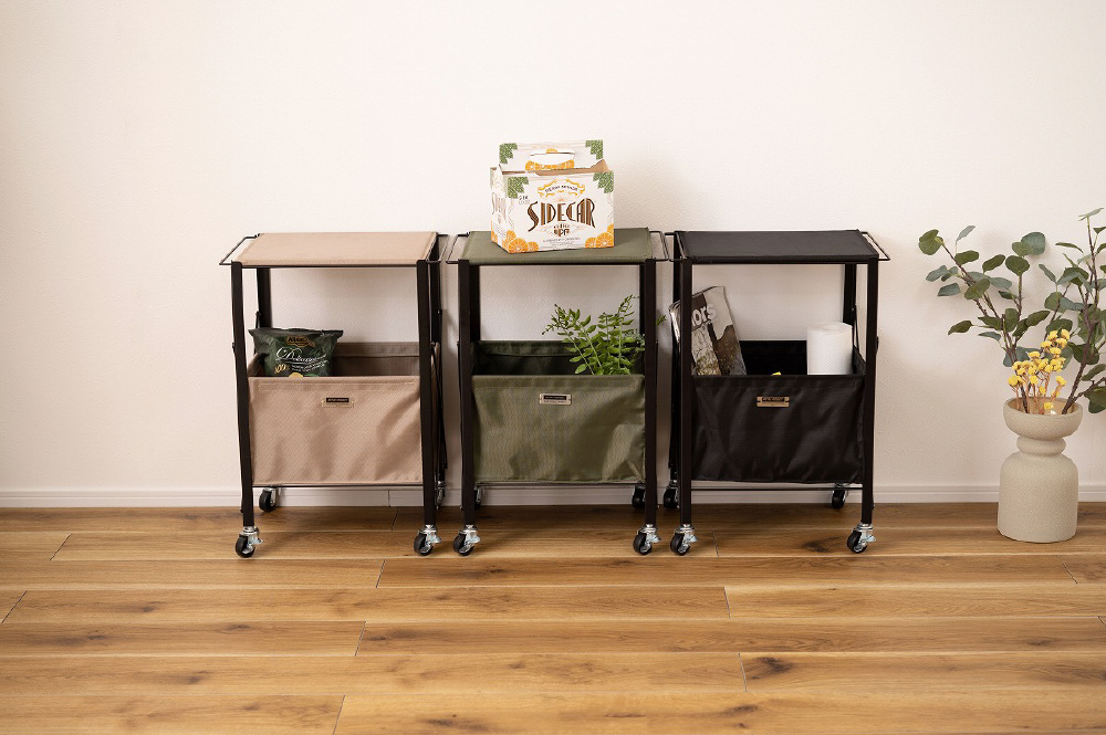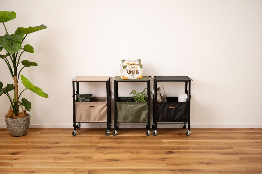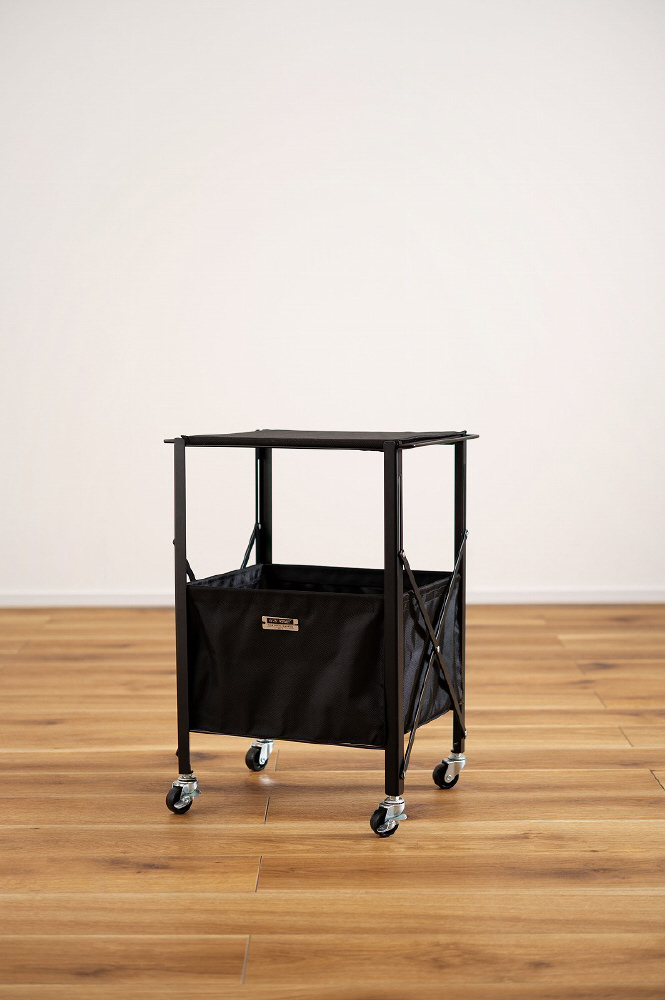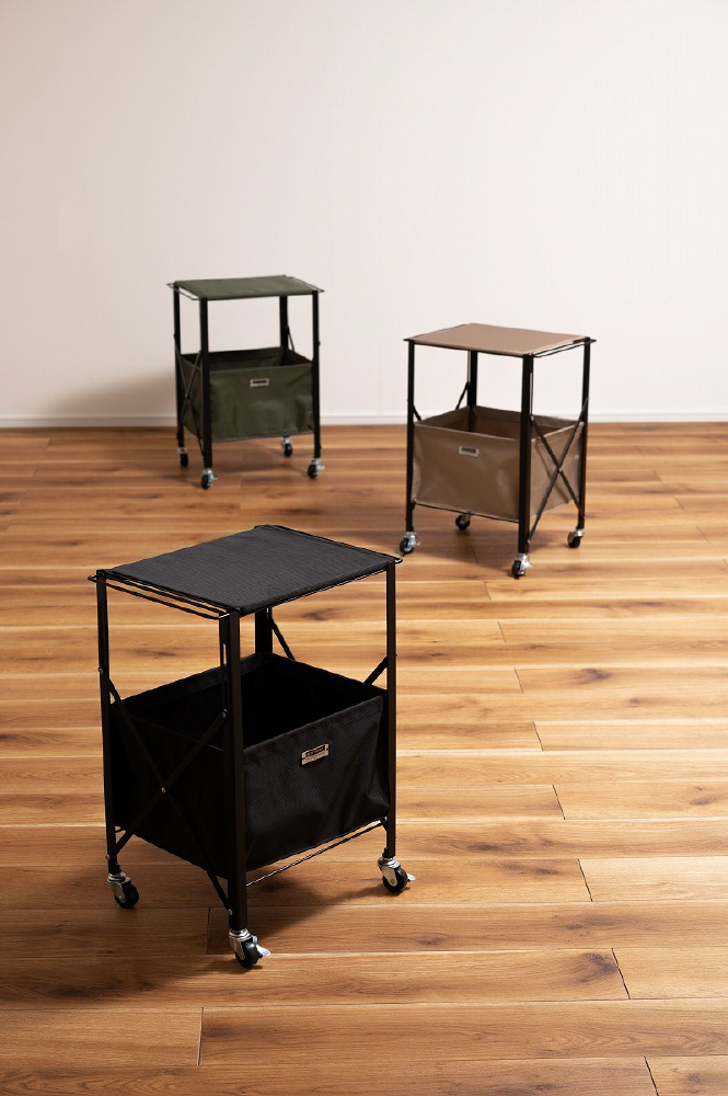 ■折りたたみができるテーブルワゴン/折りたたみができて、コンパクトに持ち運べる『フォールディングテーブルワゴン』。脚先にはストッパー付きのキャスターが取り付けられているので、移動も固定も楽に行うことができます。室内だけでなくアウトドアシーンにもぴったりなアイテムです。