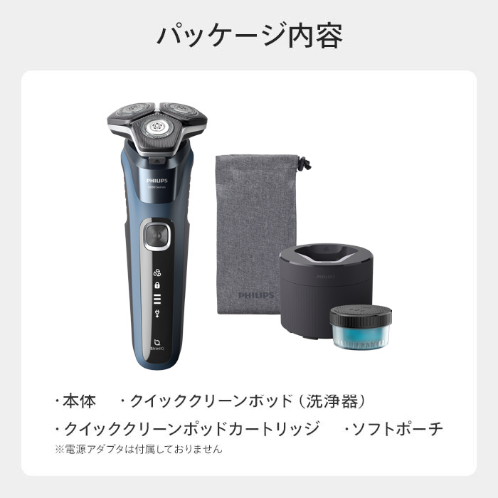 付属品 シェーバー本体、シェービングユニット、取扱説明書、グローバル保証書、 延長保証リーフレット、充電ケーブル、クリーニングブラシ、ソフトポーチ、保護キャップ、クイッククリーンポッド、クイッククリーンポッドカートリッジ、※充電アダプターは同梱 されません