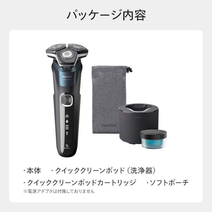付属品 シェーバー本体、シェービングユニット、取扱説明書、グローバル保証書、延長保証リーフレット、充電ケーブル、クリーニングブラシ、ソフトポーチ、保護キャップ、クイッククリーンポッド 、クイッククリーンポッドカートリッジ、※充電アダプターは同梱されません