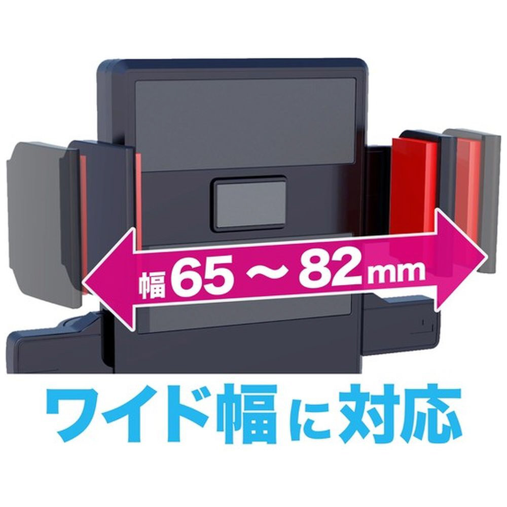 オートキャッチ機能付きで、幅65〜82mmのスマートフォンをワンタッチで挟んでホールドできるスマホホルダーです。