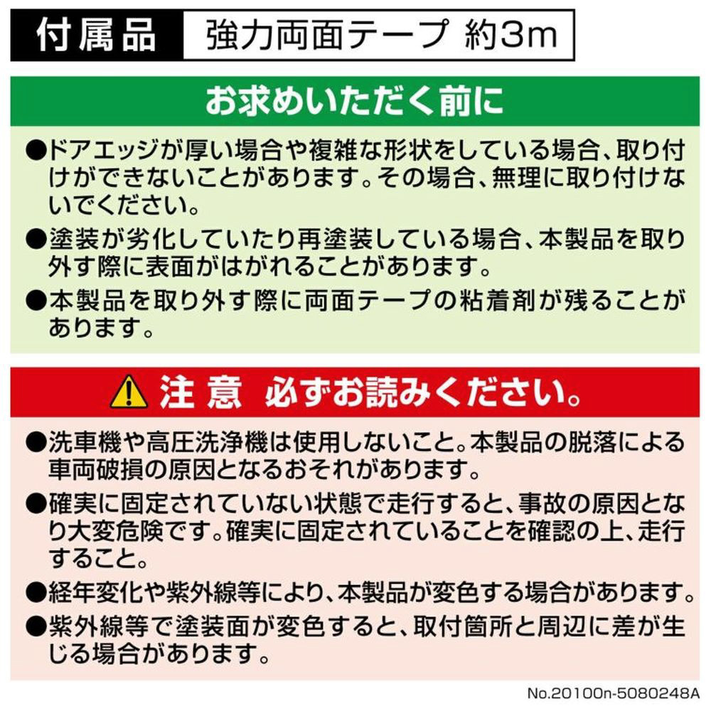 ・洗車機や高圧洗浄機は使用しないこと。脱落による車両破損の原因となるおそれがあります。