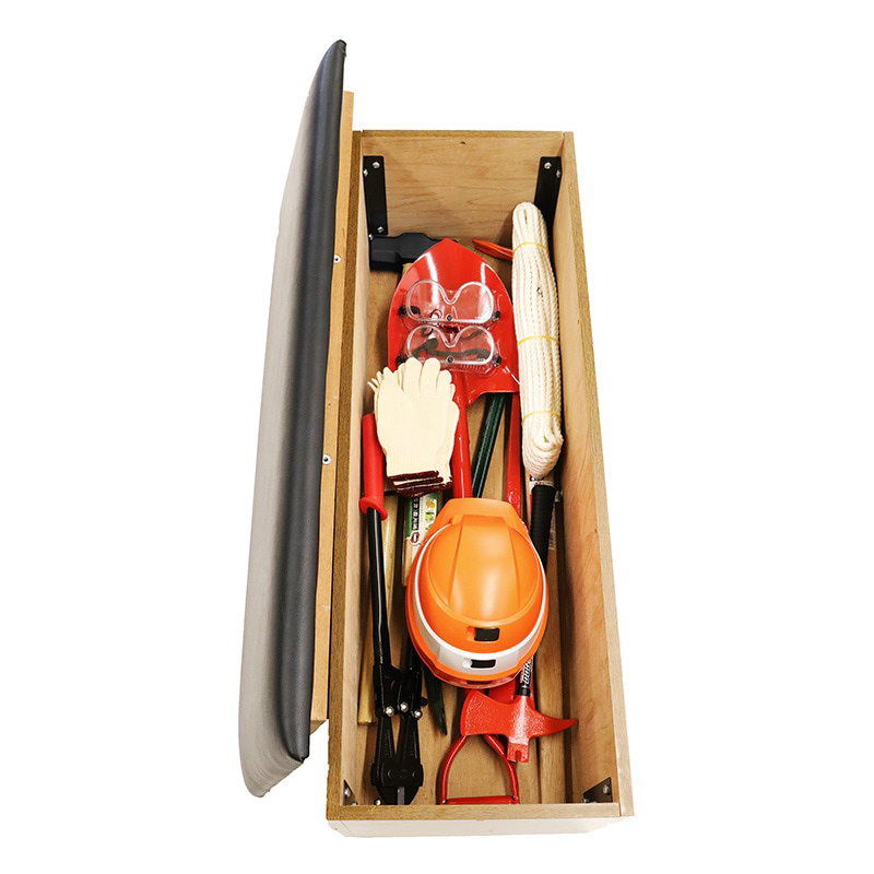 ●ベンチの中に救助工具が入った常設型。●救助活動に必要な各種道具を品質重視で厳選。●木目調仕上げでロビーベンチ内に収納でき便利です。●床面との微調整用アジャスター付き。●本体とシート部を固定するネジはつまみネジ、防盗ネジの2タイプあります。●こちらの商品はお客様組立品です。組立に要する目安時間 20分/1人●用途:救助作業用道具として。※初期救助活動は電気やエンジン等のパワーツールが使用困難となるため、ハンドツール(手工具)による人海作業となります。●設置場所例:会社や銀行等のロビー、応接室やマンションのエントランスホール、集会所、商業ビル、ホール、公共施設のロビー、病院の待合室。●セット内容:平バラシバール900mm(開かなくなった扉のこじ開けに)、金象 両口ハンマー3.6kg 樫柄付(コンクリート、ブロックの粉砕に)、レスキューアッキス(開かなくなった窓の解体に)、金象 バチツル2.5kg 900 樫柄付(壁、床の破壊、隙間のこじ開けに)、金象 防災用ショベル丸形パイプ柄 JIS規格品(土砂、コンクリートの除去に)、ボルトクリッパー 600mm(鉄筋、チェーンの切断に)、宝長久 サヤ入り鋸 240mm(倒木、家屋の木部の切断に)、ロープ 12mm×20M(脱出用、救助作業、除去作業に)、ヘルメット(頭部の保護に)、綿軍手 12双入 (工具使用時の手の保護に)、保護メガネ 2個入(工具使用時の目の保護に)※軍手、保護メガネ以外の数量は各1個となります。●付属部品:つまみネジ×6個、防盗ネジ×6個、防盗ネジ専用レンチ×1個※本体とシート部は6箇所(つまみネジもしくは防盗ネジ)で固定します。床面との微調整用アジャスター付き●座面耐荷重:150kg(静止均等)●外寸法:全長/1140mm、奥行き/440mm、全高/400mm●重量:45kg●ベンチ材質:化粧合板、合成皮革