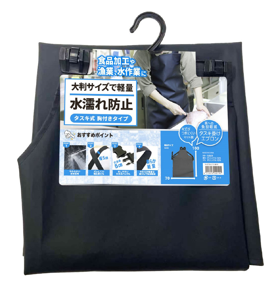 防水性に優れた胸付きエプロン。ブラックでシンプルデザイン。