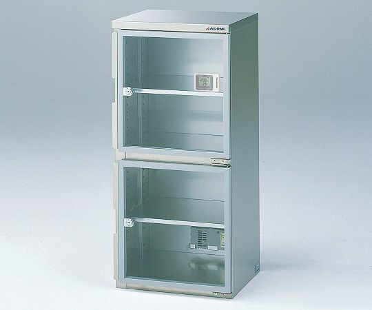 ●外寸法(mm):400×350×879●内寸法(mm):390×320×382×2室●重量(kg):16●材質:本体・棚板/SUS430、窓枠/ABS樹脂、観察窓/ガラス●除湿方式:固体高分子電解質膜により、H2O電気分解排出●到達湿度:25%RH(使用環境による)●電源:AC100V 50/60Hz●消費電力:3W●付属品:棚板×3枚、鍵×2個●デジタル温湿度モニター(THA-01M)