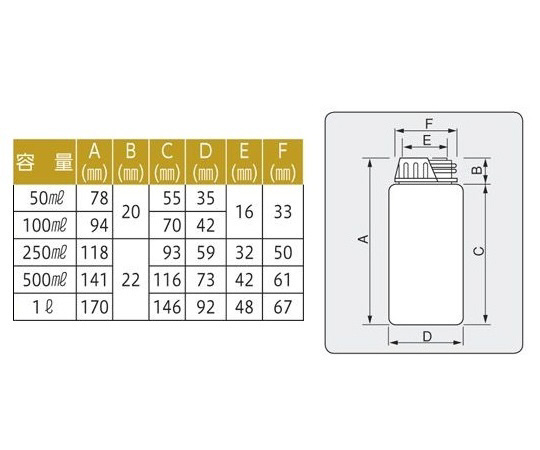 ●容量:1L●A(mm):170●B(mm):22●C(mm):146●D(mm):92●E(mm):48●F:67mm●材質:本体・フタ/PE(ポリエチレン)●耐熱温度:110℃●液モレテスト合格済み●目盛付き●入数:1本入